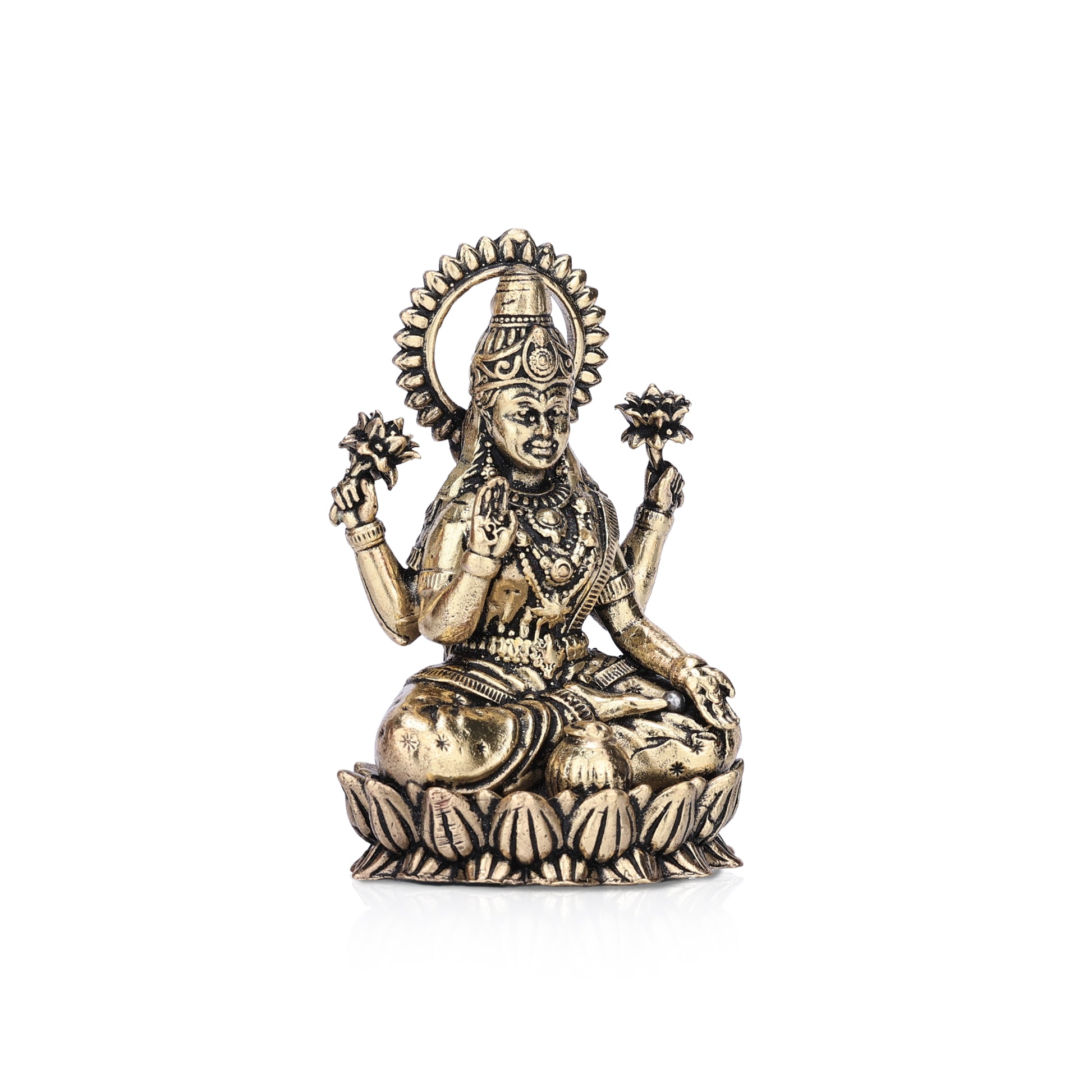 A finely detailed brass idol of Goddess Lakshmi seated gracefully on a lotus, symbolizing prosperity, abundance, and auspicious blessings. An elegant addition to your altar or sacred decor.