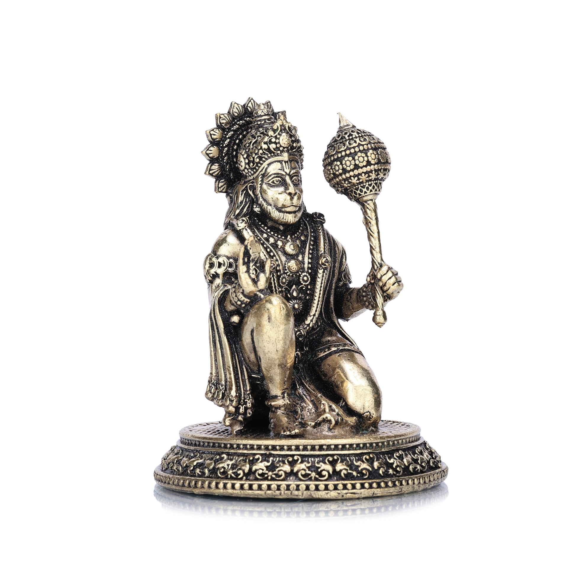 A beautifully sculpted brass idol of Lord Hanuman in a dynamic kneeling posture, symbolizing strength, courage, and unwavering devotion. A powerful addition to your altar or spiritual decor.