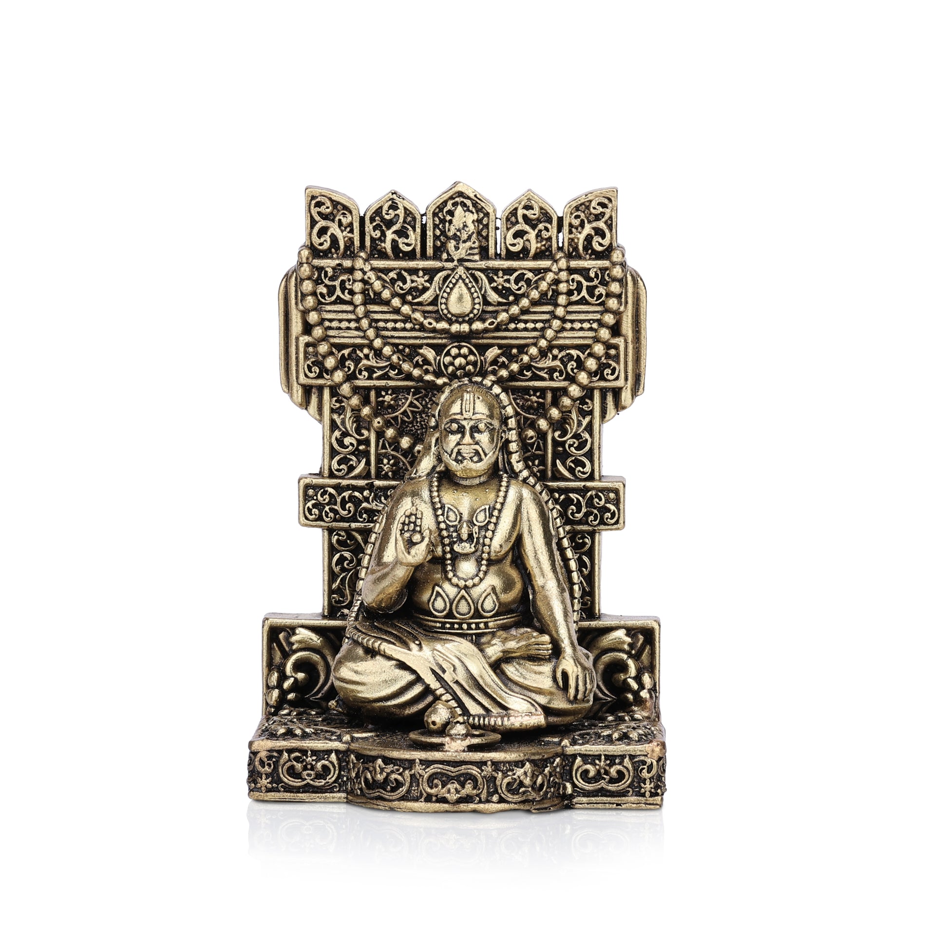 • A beautifully sculpted brass idol of Shri Raghavendra Swamy, portrayed in a serene seated posture that symbolizes wisdom, devotion, and divine blessings. A sacred addition to your room or home temple.